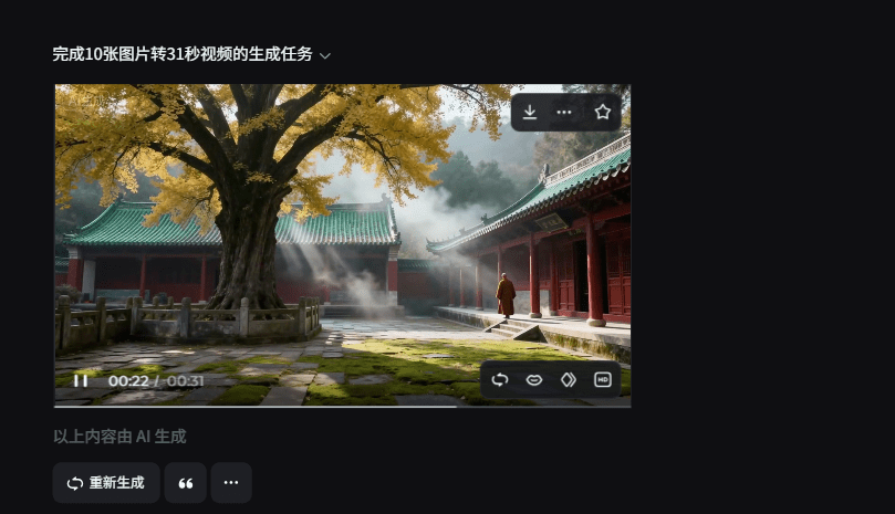 生成完成咱们下载下来就行,也可以利用首尾帧一张一张的去做视频哈不想用AI生成的视频,也可以自己去网上下载这种禅意的素材下一步是剪辑,剪辑之前记得把配音配好哦,我用的是配音蜂