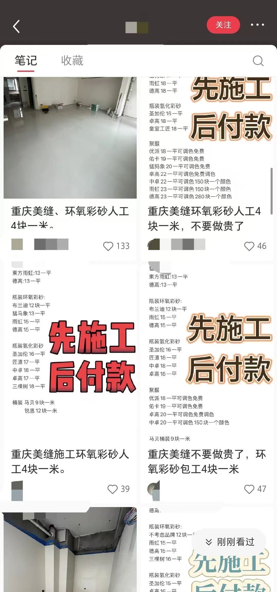 然后笔记标题搜索关键词打好,重庆美缝施工,评论区都是问的,其实小红书就是靠一些手段先把客户引流进来,至于你最终的服务是不是你说的那样都还好,因为都可以靠销售话术去转化,主要是需要有流量进来。