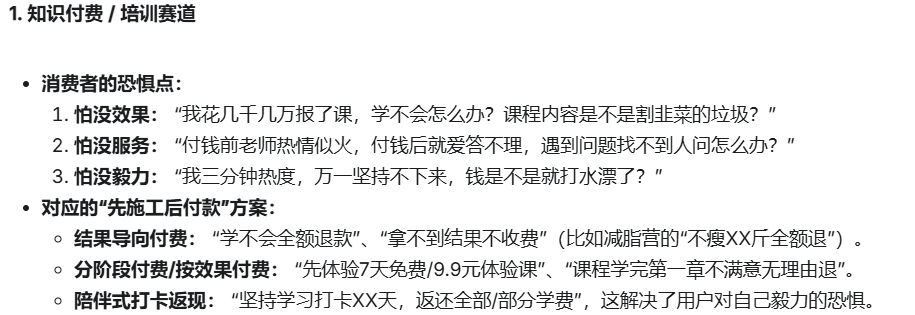 比如知识付费赛道,大家怕的是什么,怕没效果,怕没服务,怕自己坚持不下来学习,所以大家就会发现现在很多人做知识付费都会用到没结果退款,每天打卡这样的技巧去做吸引。