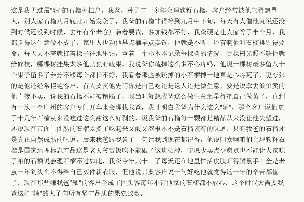 然后这种文案其实我们可以用在自己的行业,这里晓晓洋用陪跑课程的技巧很快的写了提示词,然后看效果,比如我想以一位女儿的视角给在四川会理种石榴的父亲宣传一下,就可以用到这种价值反转的文案技巧。