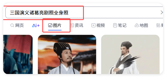 1.我习惯用百度网页,直接搜索“三国演义诸葛亮剧照全身照”,剧名+角色,尽量选择全身照,方便后边AI生图少抽卡