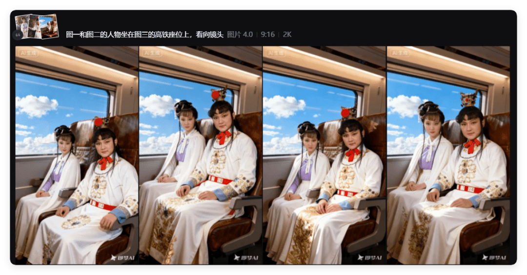 图一和图二的人物坐在图三的高铁座位上,看向镜头