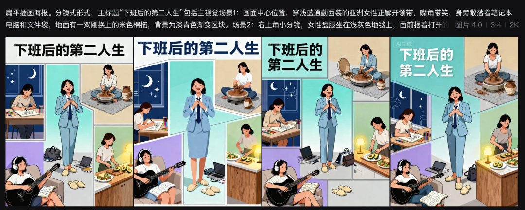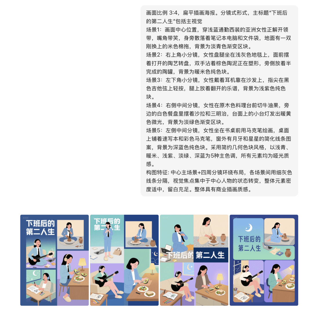我输入的是“下班后的第二人生”,豆包给到我的图片提示词: