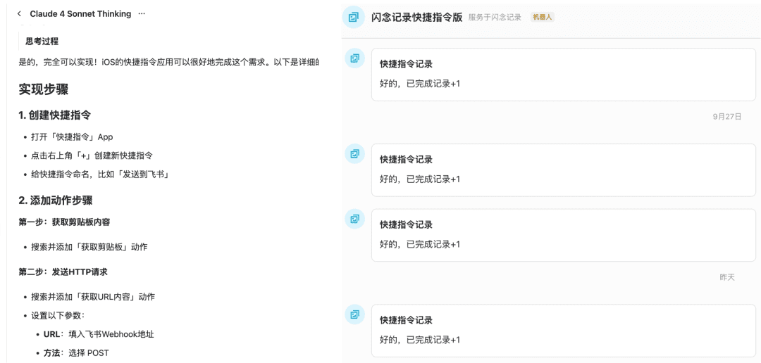 然后我借助AI做了一个快捷指令,在任意位置把灵感记录下来,然后复制,调出快捷指令,自动记录到飞书,这样能确保我不会遗漏每一个想法。