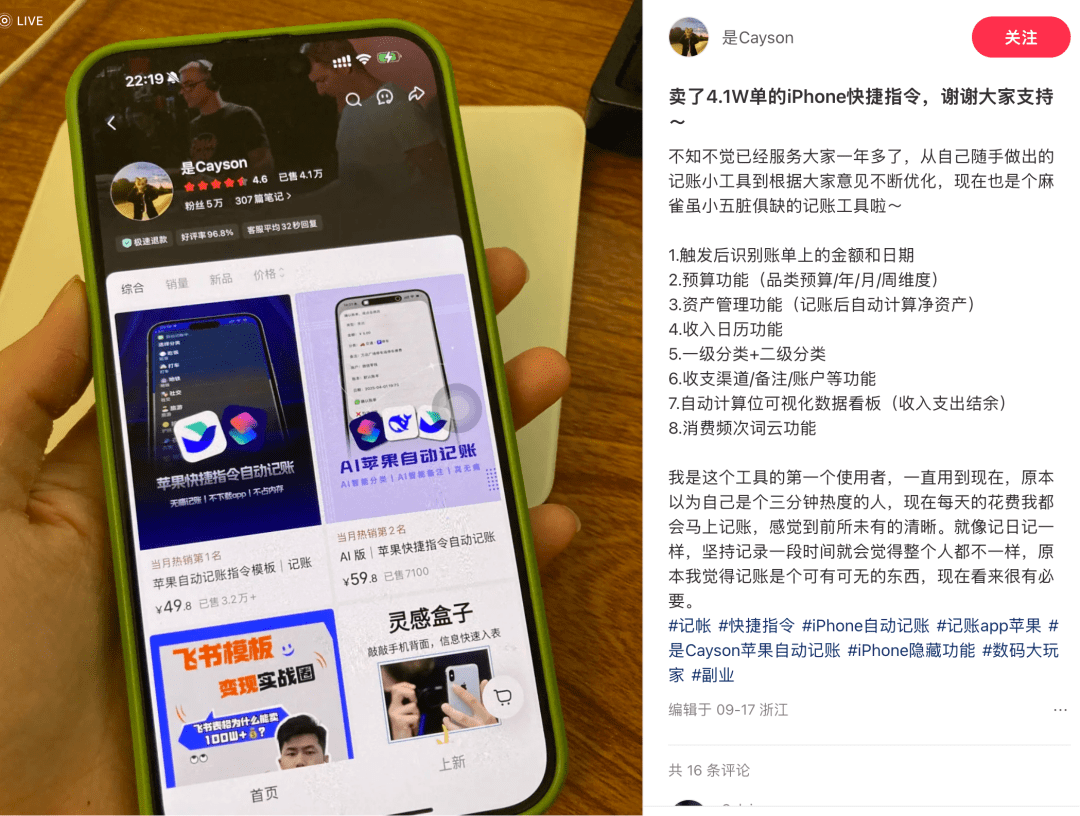 是Cayson:卖苹果快捷指令记账,49.8元一份,卖了3.2万单,还有个59元的卖了7000单,加起来200万+。