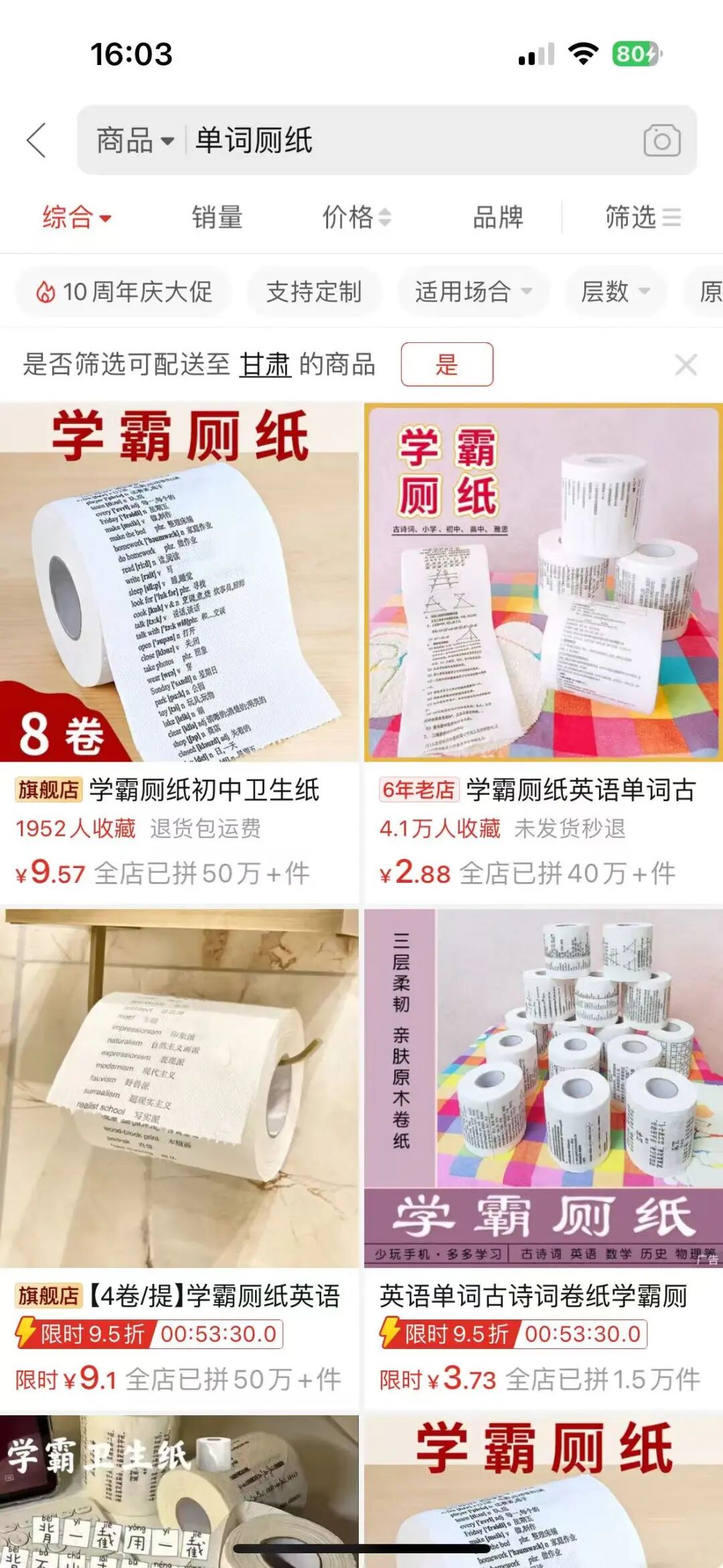 这种类似的形式还有很多,咋其他平台搜索相关的关键词会出现各种不同的产品,这写也都是值得借鉴使用的。就像这个直接卖厕纸,可能销量提不上去,但是在上面印了英语单词,一下营销对象就不太一样了,同时厕纸也不仅仅只有这一个功能了。