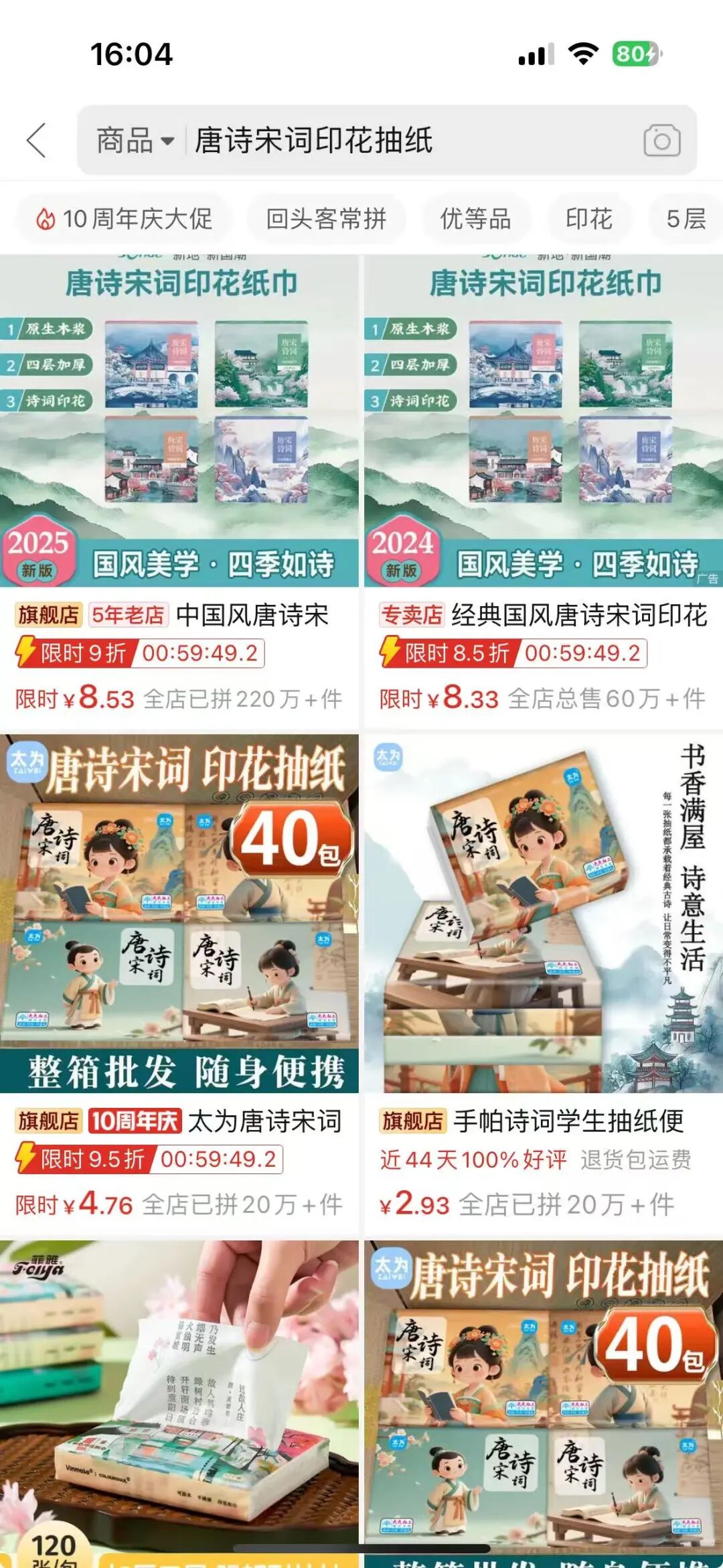 另外还有这个背诵古诗的玩法,通过印花抽纸的形式,让诗词出现在抽纸上,一瞬间这章抽纸更有了文化气息,看这个销量就知道,客户还不少,有时候赚钱就是这样,换一个思路,收获完全不一样。