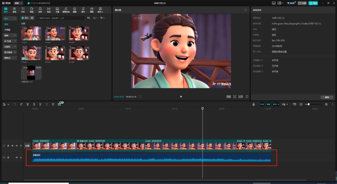 我们将获取的视频导入到剪映里面,因为我们使用数字人做的视频本身就是有音频的,所以按顺序将视频拼接一起就可以了。