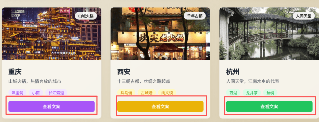 我还添加了 【一键复制】以及【重新生成】按钮【重新生成】这个按钮的主要作用是针对于同一个城市或者某个地方,能生成不同的文案,方便大家的选择【复制文案】这个按钮主要就是方便大家复制,哈哈 另外,还做了几个城市的案例,点击网页右上方的【城市案例】查看即可