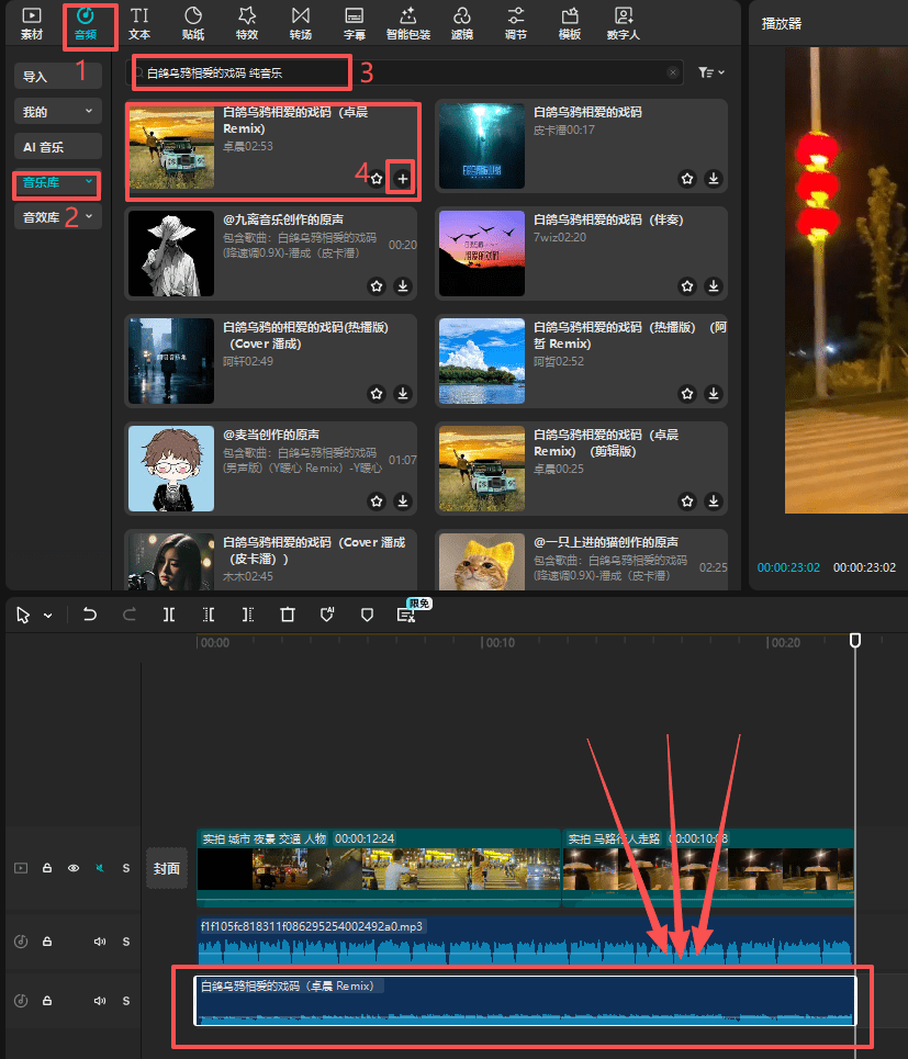 关于素材,可以去抖音上搜一些相关的视频画面,比如西安城市全景,空镜头,肉夹馍,biangbiang面等,添加到主轨道上(点击图片可以放大查看)然后选择音频,添加背景音乐,搜索【白鸽乌鸦相爱的戏码】(点击图片可以放大查看)