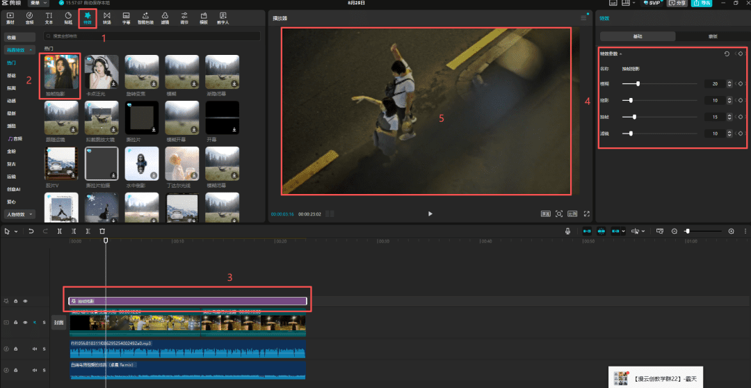 为了让视频看起来更有氛围感,我们可以适当的加一些特效,比如「抽帧」这个增加一些抽帧模糊(点击图片可以放大查看)