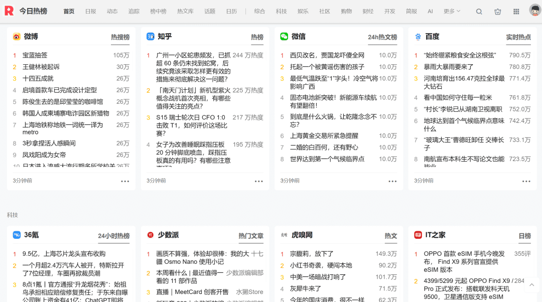 2. 今日热榜https://tophub.today简洁高效的聚合平台,按领域划分综合、科技、娱乐、社区、购物五大板块,实时更新各平台热榜。