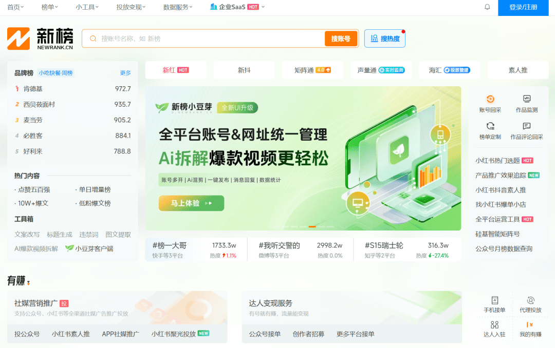 新媒体行业权威榜单,覆盖微信公众号、抖音、快手、视频号等18+平台,提供账号排名、内容分析、商业价值评估。