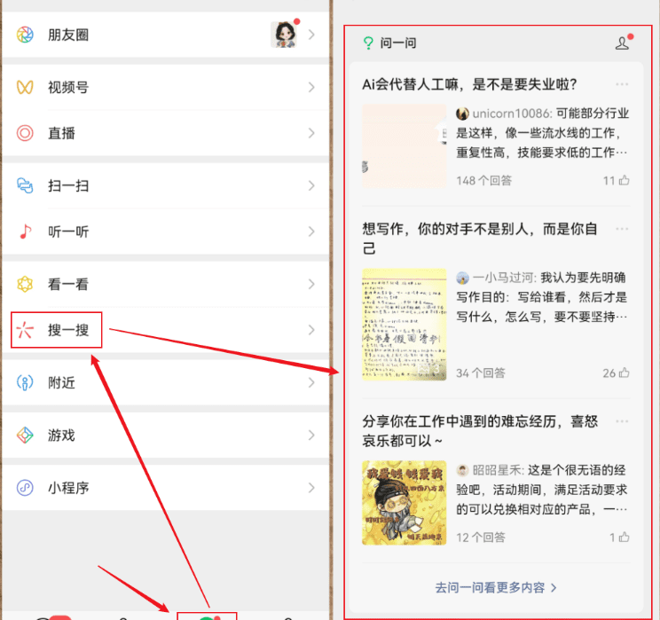 打开微信,点击底部的【发现】选项,选择【搜一搜】,在这里你就能找到问一问。