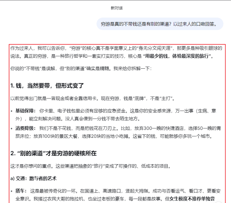 例如,如果某个回答是:“妹子,你是不是刷短视频刷多了?作为过来人,我明确告诉你,所谓的穷游……” ,那么在第一句加上口语化的内容,让整段话听起来更亲切,既不被系统识别出是机械生成的,听众也更容易接收。