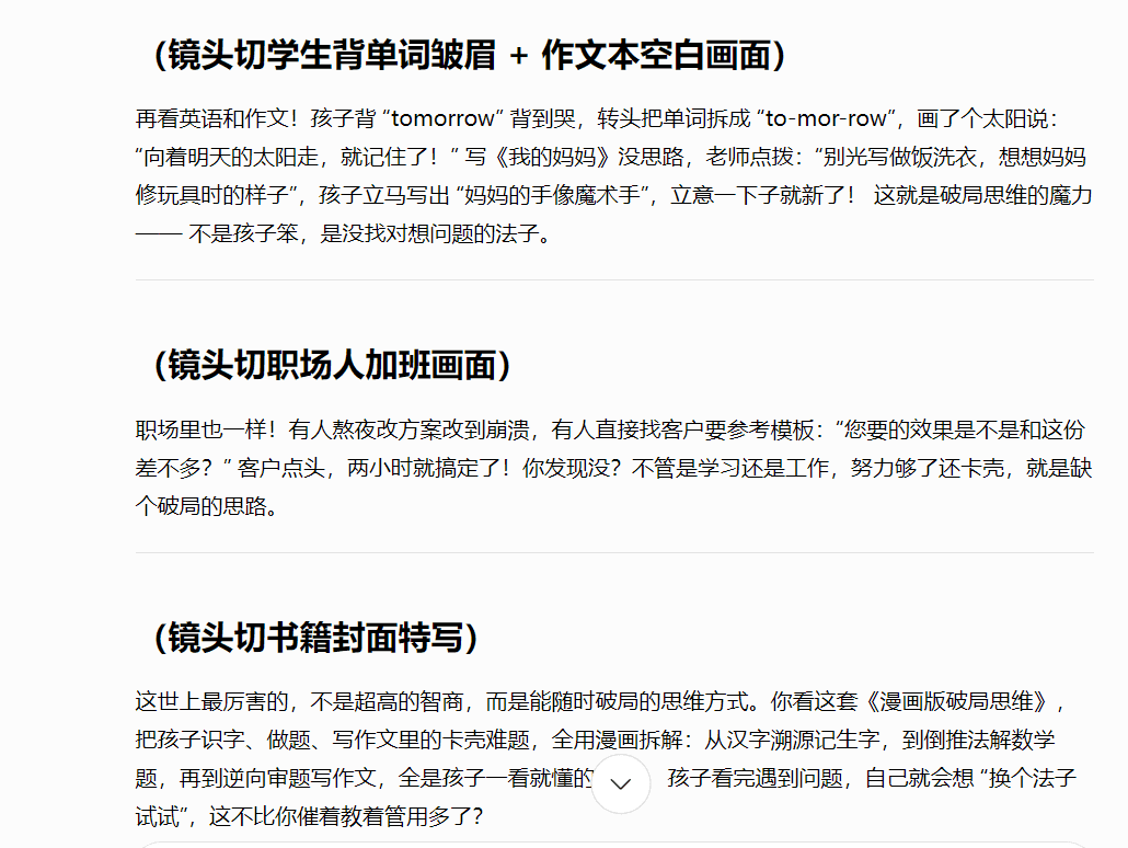 用“反差悬念故事”开场抓牢注意力,再通过不同领域的案例展现思维破局的力量,接着提炼故事的核心理念、引出产品书籍《漫画版破局思维》。 核心理念:在所有故事讲完后,用一句话总结升华:“这世上最厉害的,不是XX,而是XX的思维方式。 风格要求: