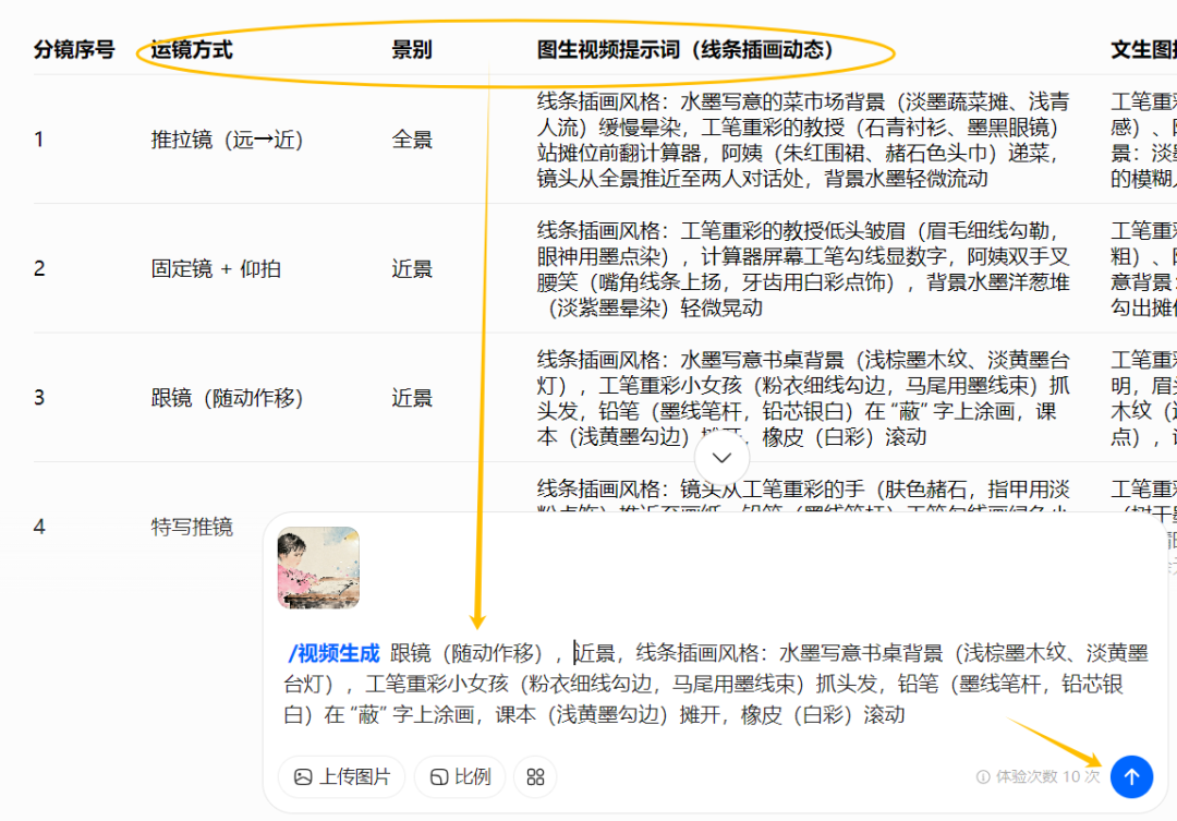 根据生成的文案,帮我生成10组对应的分镜头脚本,要求提供运镜,景别,图生视频提示词,文生图提示词,图片要线条插画风格,主体人物采用工笔重彩技法,背景采用水墨写意技法,人物与背景风格要保持一致,以表格形式提供。