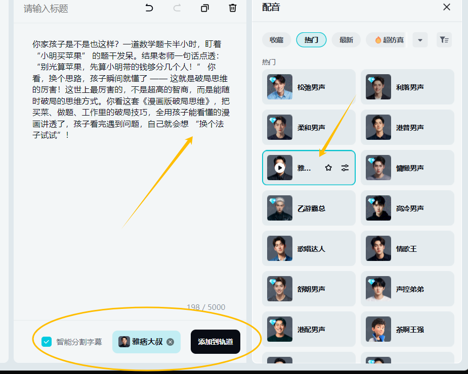 选择智能口播,把豆包生成的文案复制进去,然后选一个自己喜欢的音色配音,打开【智能分割】–添加到主轨道,