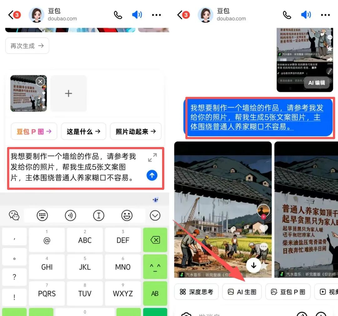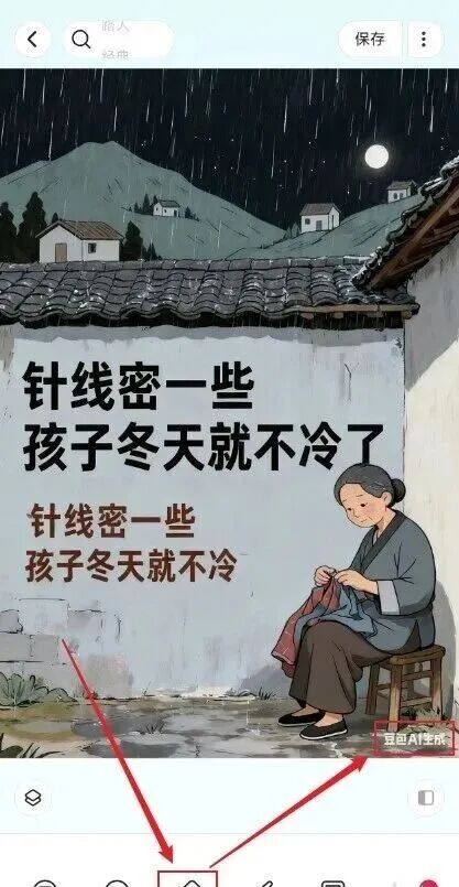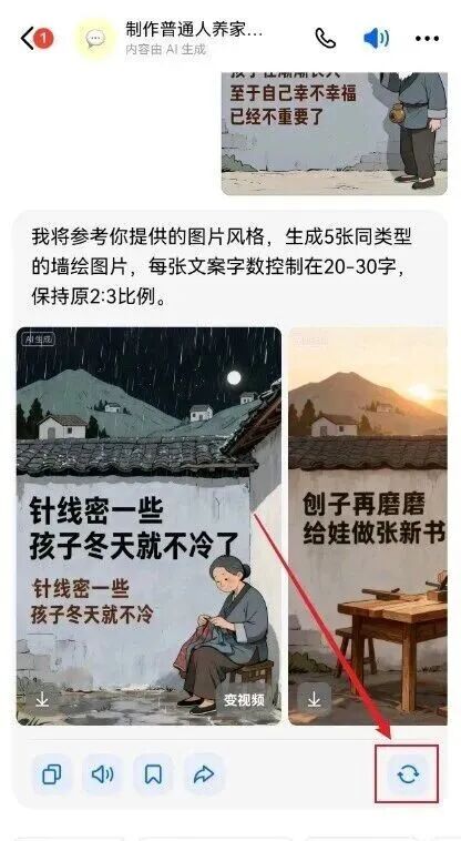 第一步:生成文案图打开豆包,选 “AI 生图”,导入一张参考图(比如老人织毛衣、路灯下的外卖员), 比例设 9:16,再附上提前找好的文案(比如 “针线密一些,孩子冬天就不冷了”),等几秒就出 5 张图,不满意可重生成。