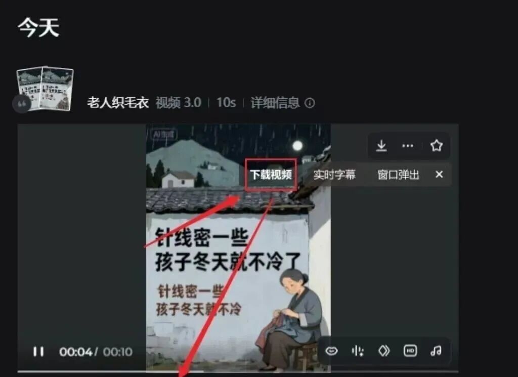 3.做成 10 秒视频打开即梦 AI,点 “视频生成” 导入图片,描述动作(如 “老人缓慢织毛衣”), 时长改 10 秒,分辨率选 720P,等 1-2 分钟下载。最后用剪映加伤感背景音乐,视频就完成了。