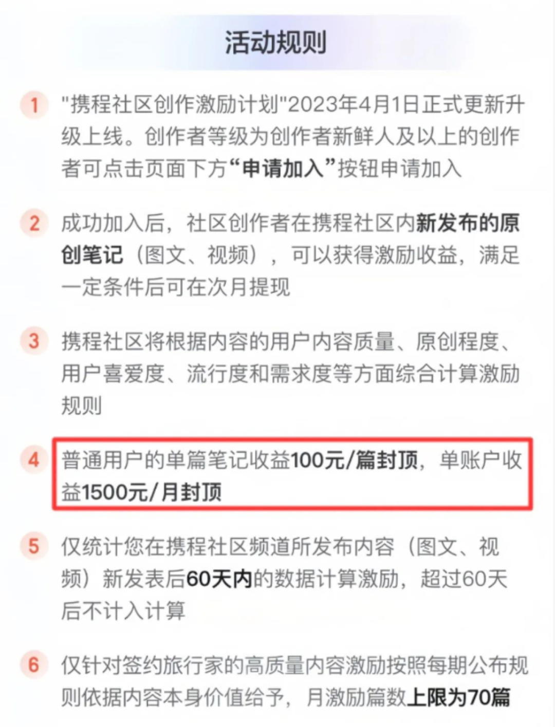 玩法特别简单!加入携程的创作激励计划后,只要在平台发布笔记,就能拿到平台发放的收益。划重点:单篇笔记最高能赚 100 元,单个账号每月收益上限可达 1500元!