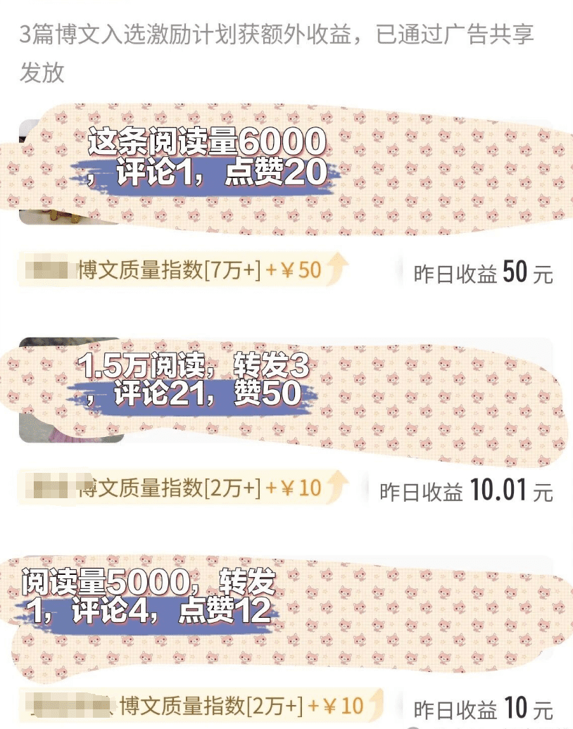不过这奖励跟浏览量、互动量不一定挂钩,我之前有三条微博,第二条数据比第一条好很多,但收益才 10 块,第一条反而有 50。