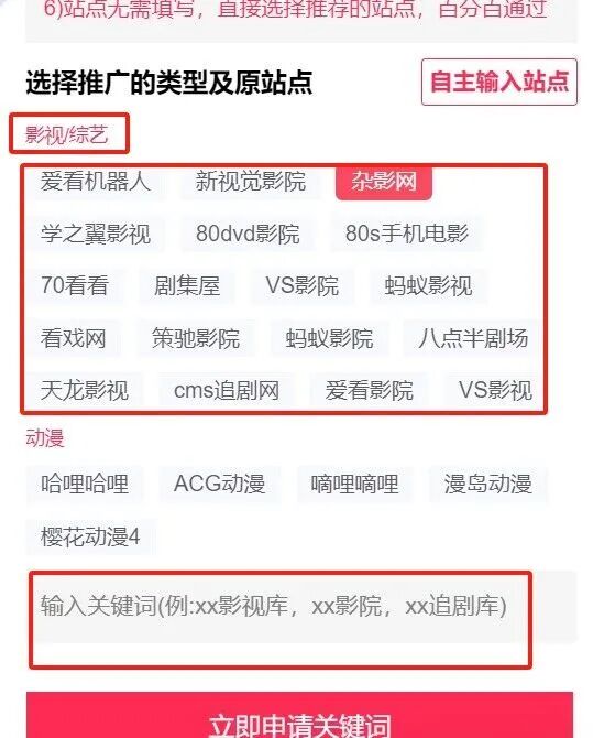 如影视、综艺、动漫类站点,然后按技巧输入关键词(避免常规词,可组合八竿子打不着的字,如 “极简标题”“冒险的梦”“赞圈影院” 等)申请。