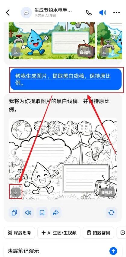 只需等待几秒钟,豆包就会给你生成几张图片,生成之后你只需要发送指令“提取黑白线稿,保持原比例”就行,如下图