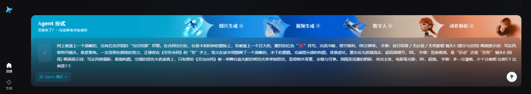 1.打开即梦,选择Agnet模式,输入分镜提示词,后缀加上比例1:1,点击生成。