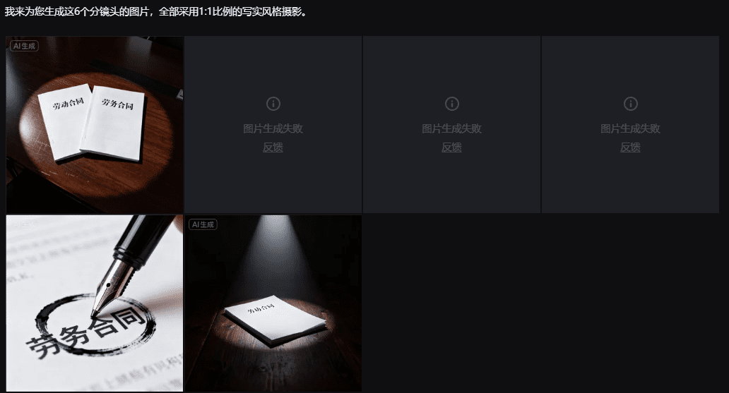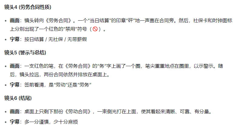 ①接下来生成对应的分镜提示词:帮我根据上面的文案,生成写实风格的分镜头提示词,要求:①不要出现人物,避免干扰观众注意力;②每个要点对应一个镜头:比如‘适用人群’配‘桌面上放着两份合同,左边是红色封面的劳动合同,右边是蓝色封面的劳务合同,旁边放着一支笔’;③‘权益区别’配‘劳动合同旁放着社保缴费单、加班费计算表,劳务合同旁放着兼职结算单’;④‘避坑建议’配‘手拿着手机拍摄合同标题,屏幕上圈出 “劳动” 两个字,旁边放着文件夹’;⑤风格是写实摄影,色调偏冷(显专业),4K 高清。