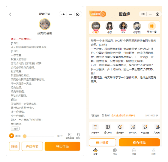 1.打开配音蜂小程序,粘贴文案,选择合适的音色,点击生成音频。