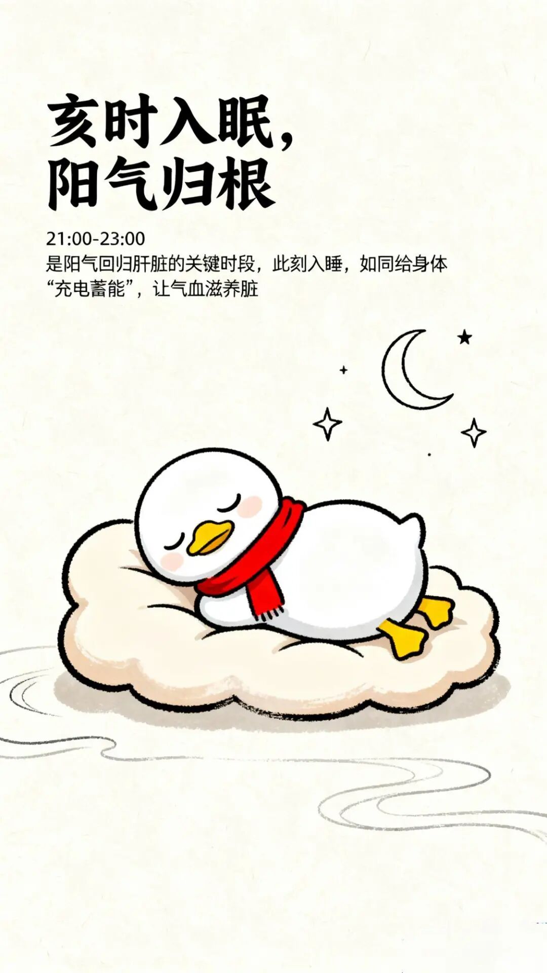 手绘卡通白鸭子(圆头团子造型,红围巾、黄嘴黄脚),闭着眼睛趴在柔软的云朵形状小床上,身体呈现放松的蜷缩状;米白色背景,左上角用毛笔黑体写主标题 “亥时入眠,阳气归根”,下方用小字写配文说明"21:00-23:00 是阳气回归肝脏的关键时段,此刻入睡,如同给身体 “充电蓄能”,让气血滋养脏腑,为健康打下好基础。";画面右侧画一个简约的月亮和几颗星星,线条流畅柔和,整体留白充足,色调温暖治愈。,比例 「9:16」
