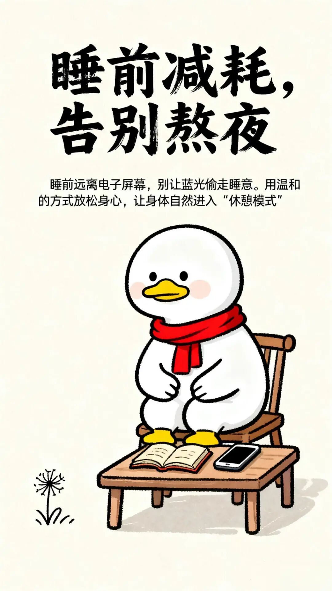 手绘卡通白鸭子(圆头团子造型,红围巾、黄嘴黄脚),坐在小椅子上,双手轻轻放在膝盖上,面前的小桌子上放着一本翻开的纸质书,旁边是关掉屏幕的手机;米白色背景,上方用毛笔黑体写主标题 “睡前减耗,告别熬夜”,下方用小字写配文说明"睡前远离电子屏幕,别让蓝光偷走睡意。用温和的方式放松身心,让身体自然进入 “休憩模式”";画面左下角画一朵小小的蒲公英,线条简洁,色彩柔和,整体氛围宁静舒缓。,比例 「9:16」