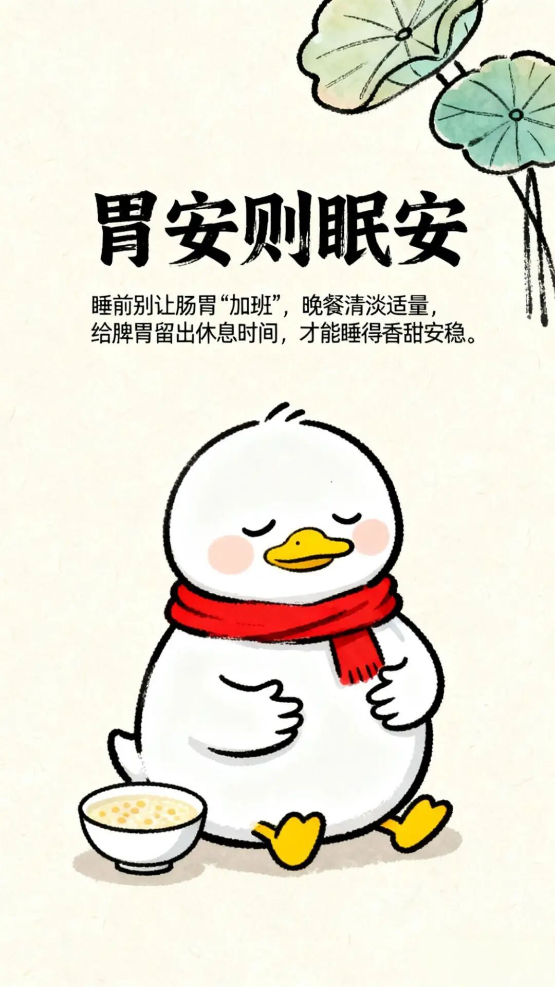 手绘卡通白鸭子(圆头团子造型,红围巾、黄嘴黄脚),双手轻轻抚摸圆滚滚的肚子,脸上带着满足的微笑,旁边放着一碗简约的小米粥插画;米白色背景,中间用毛笔黑体写主标题 “胃安则眠安”,下方用小字写配文说明"睡前别让肠胃 “加班”,晚餐清淡适量,给脾胃留出休息时间,才能睡得香甜安稳。";画面右上角画几片简约的荷叶,线条流畅,色彩清新,整体画面简洁舒适。,比例 「9:16」最后说几句