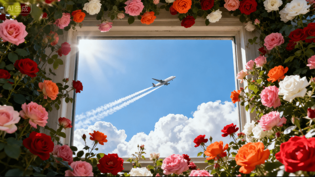 2.画面生成网址:https://jimeng.jianying.com/ai-tool/generate/?type=image图片模型选择图片4.0输入提示词:超低角度仰拍,框架式构图,繁茂的多色玫瑰花丛(红、粉、橙、白等)环绕矩形窗口,窗口内是澄澈蓝天、蓬松白云,一架飞机拖曳航迹云飞过,明亮阳光洒下形成柔和光影,整体清新治愈,细节细腻写实