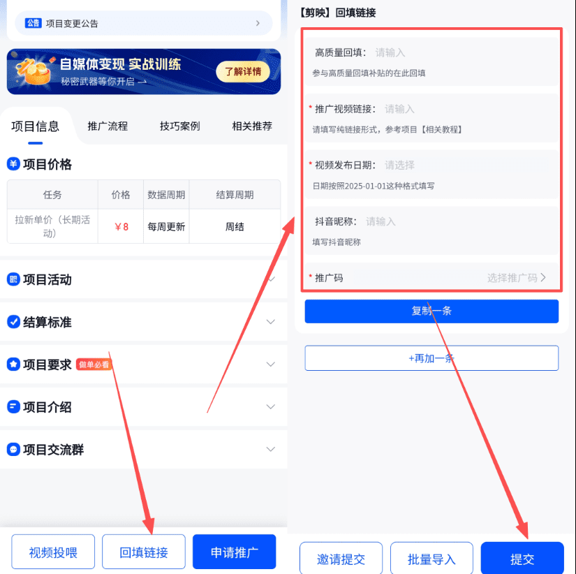如何操作?1、申请授权找到平台后,找到剪映拉新这个项目,在项目详情页进行报备如下图:(平台入口在文末获取)