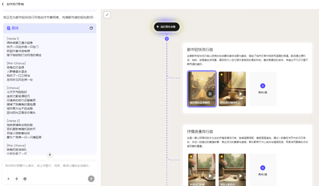 很快就能生成两首基本都音乐,如果不满意还可以自行添加,点击停留一下,整体音乐的氛围非常好。很动听,也很有感觉。如果你觉得提示词很麻烦,直接输入你想要的音乐类型让他快速生成也可以。