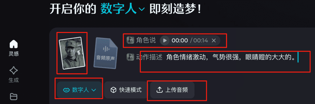 按照相同的方法,将我们上一步准备的所有图片都生成Q版图片,然后将给我们生成的图片无水印下载下来备用。 第三步:即梦对口型 下面打开即梦,选择数字人功能,点击角色,上传我们刚才生成的Q版图片,点击上传音频按钮,将经典影视剧的音频上传上去,尽量清楚的描述画面的肢体动作,如下图所示:
