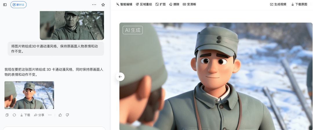 | 将图片转绘成3D卡通动漫风格,保持原画面人物表情和动作不变。 |