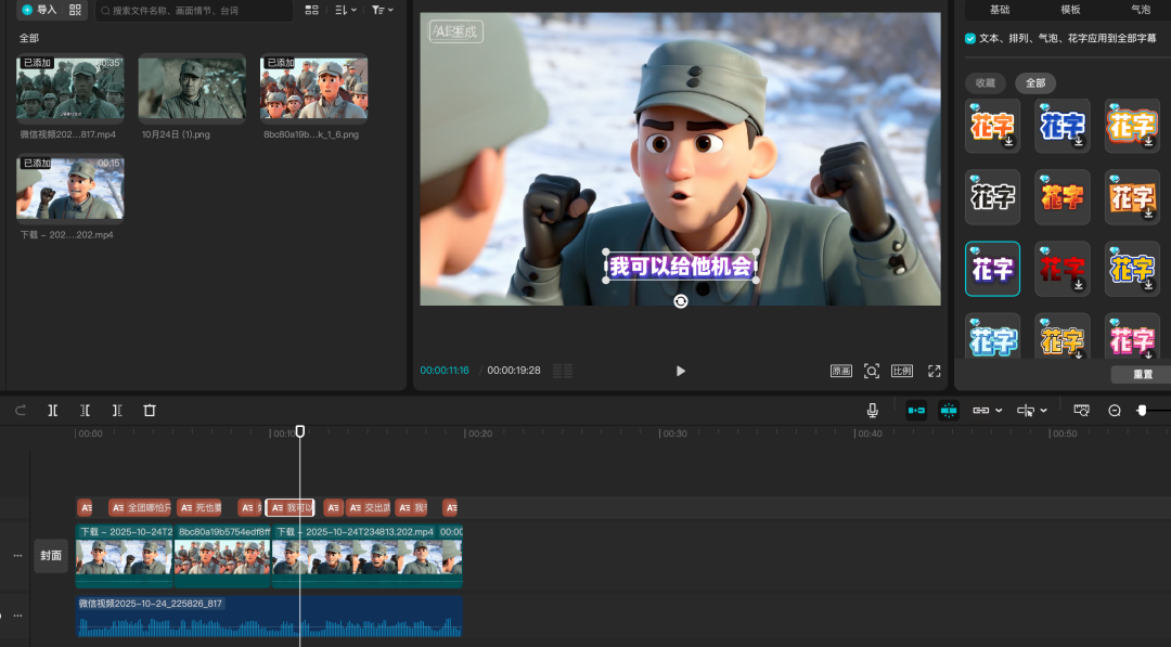 按照步骤,生成所有的视频片段,然后将无水印版本下载下来。 第四步:剪映剪辑成片 打开剪映,将我们上一步生成的对口型视频都导入到剪映内,按照顺序拖入主轨道,增加字幕,添加背景音乐,音效等,导出即可。