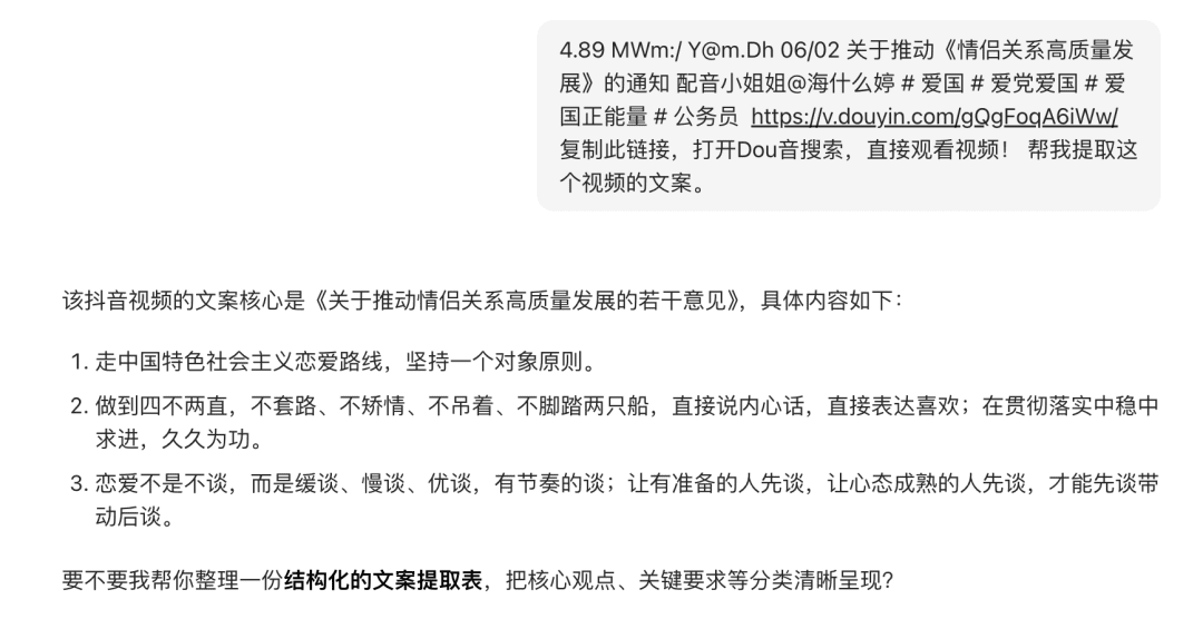 这类视频的关键之处在文案上,文案的制作我们都可以借助于AI,所以整体的制作难度不大,核心点是通过国家推行的政策进行正向的解读,层层递进,非常易于理解和传播。 下面就带大家一起来拆解这类视频的制作方法。 第一步:生成文案 我们首先找到我们要对标的爆款视频,将爆款视频的链接发送给豆包,让豆包将爆款文案给我们提取出来。