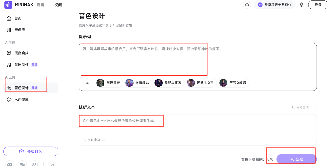 第二步:制作音频 大家如果对音频的质量要求比较高,可以选择我前段时间给大家推荐的MiniMax来生成音频,网址如下: https://www.minimaxi.com/audio 因为这个音频设计工具,可以自己设计音色,并且生成的音频质量也是非常高的。