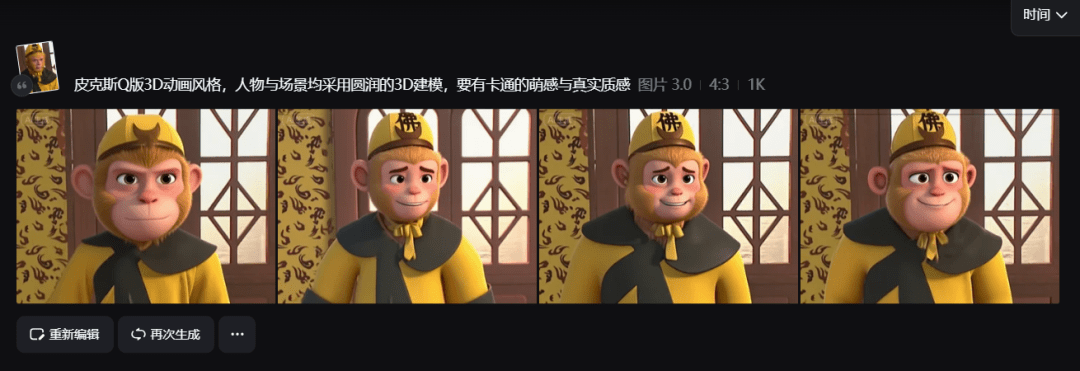输入指令:皮克斯Q版3D动画风格,人物与场景均采用圆润的3D建模,要有卡通的萌感与真实质感,比例3:4或者9:16都行,标清1k,点击生成。