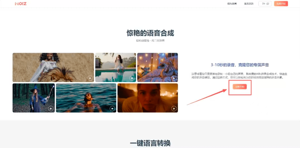市面上能够克隆声音的AI工具很多:Nozi,Minimax(海外版)等都有免费的额度可以使用,大家选择适合自己的工具使用即可。这里以Nozi为例,给大家进行示范。Nozi地址:https://noiz.ai/landing打开Nozi→点击立即开始