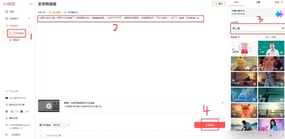 选择文本转语音→填写文案→音色选择唐三藏→立即生成