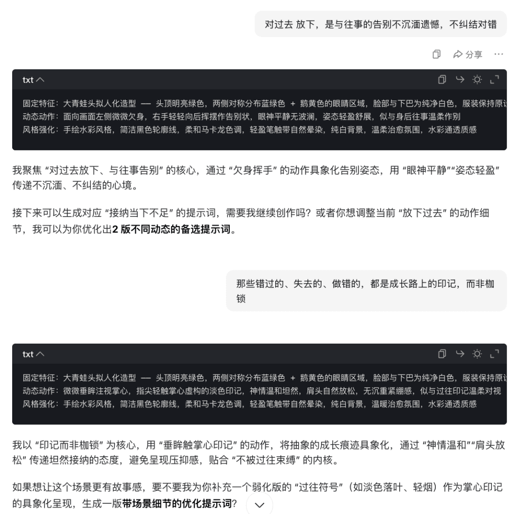同个形象需要新的动作表情的话,可以在同个对话里继续比如: