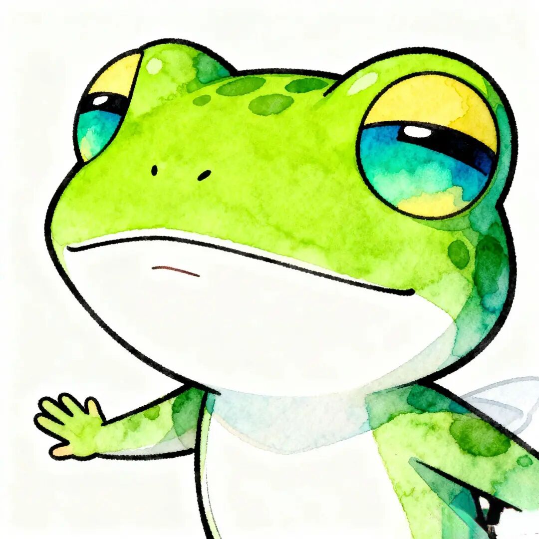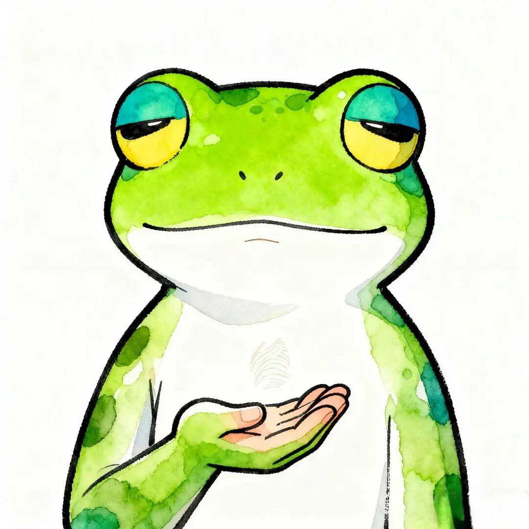 固定特征:大青蛙头拟人化造型 —— 头顶明亮绿色,两侧对称分布蓝绿色 + 鹅黄色的眼睛区域,脸部与下巴为纯净白色,服装保持原设动态动作:微微垂眸注视掌心,指尖轻触掌心虚构的淡色印记,神情温和坦然,肩头自然放松,无沉重紧绷感,似与过往印记温柔对视风格强化:手绘水彩风格,简洁黑色轮廓线,柔和马卡龙色调,轻盈笔触带自然晕染,纯白背景,温暖治愈氛围,水彩通透质感