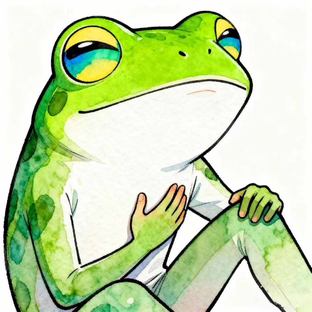 固定特征:大青蛙头拟人化造型 —— 头顶明亮绿色,两侧对称分布蓝绿色 + 鹅黄色的眼睛区域,脸部与下巴为纯净白色,服装保持原设动态动作:侧身静坐,一手轻搭膝盖,一手温柔抚摸胸口,眼神柔和望向远方,神态舒展放松,似放下纠结的释然状态风格强化:手绘水彩风格,简洁黑色轮廓线,柔和马卡龙色调,轻盈笔触带自然晕染,纯白背景,温柔治愈氛围,水彩通透质感