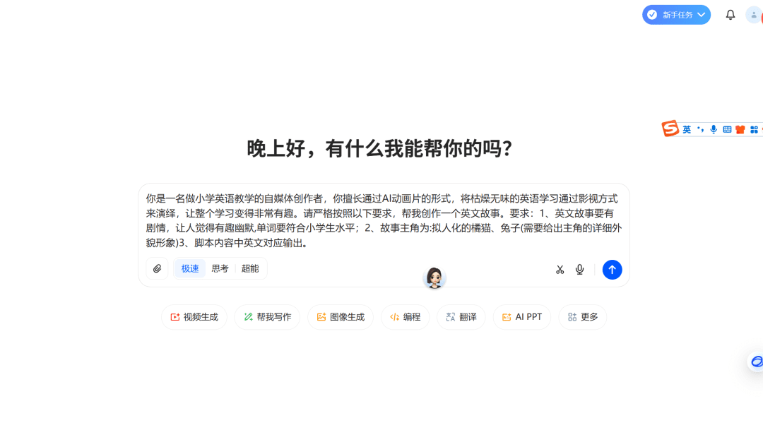 实战教程1.文案生成文案生成常用kimi、deepseek、claude、chatgpt或者豆包等等工具进行生成,这边我主要是为了方便我做案例,因此才选择豆包。输入提示词:你是一名做小学英语教学的自媒体创作者,你擅长通过AI动画片的形式,将枯燥无味的英语学习通过影视方式来演绎,让整个学习变得非常有趣。请严格按照以下要求,帮我创作一个英文故事。
