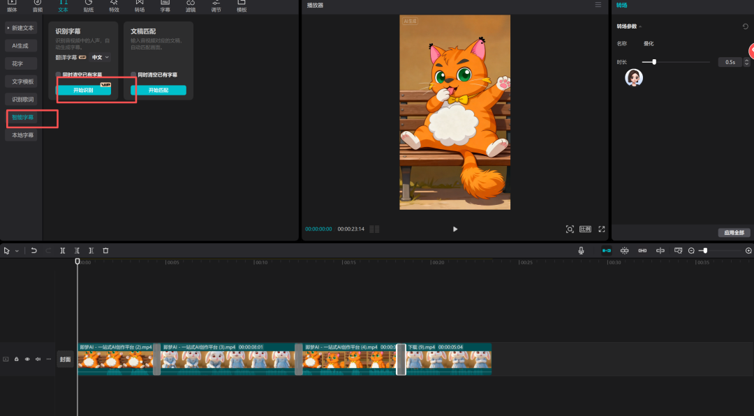点击文本,选择智能字幕,选择翻译字幕为中文,点击开始识别,就会生成中英文字幕